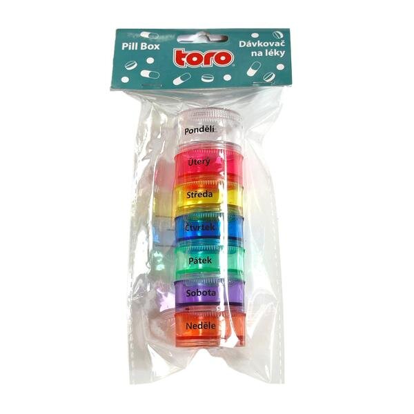 - Dávkovač na léky rozdělený do 7 přihrádek, jedna pro každý den (pondělí až neděle).