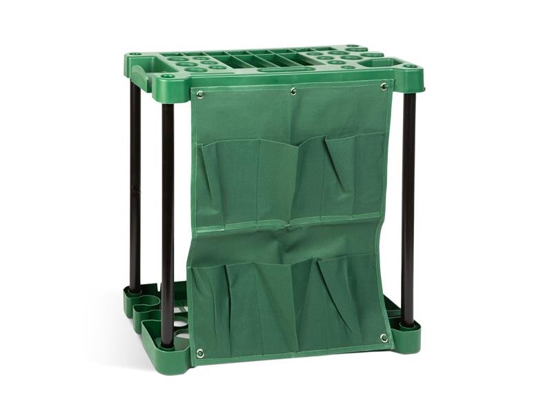 Velký zahradní držák nářadí, který je vhodný pro skladování jakéhokoli ručního nářadí. Díky různým velikostem otvorů najdete pro každý nástroj správné místo. ...ale i pro skladování lopaty, rýčových lopatek, shrabovaček a zavlažovacích hadic tradiční velikosti.Držák nářadí můžete vzít s sebou na zahradu, takže při práci jsou k dispozici všechny nástroje, konzolu lze připevnit ke stěně pomocí 4 háčků.Sáčky na plátno na přední straně také umožňují ukládat další nástroje a vybavení. Všestranný produkt je díky své variabilitě a montáži na stěnu vyplnění úložných kapes omezeno pouze na vaší fantazii.