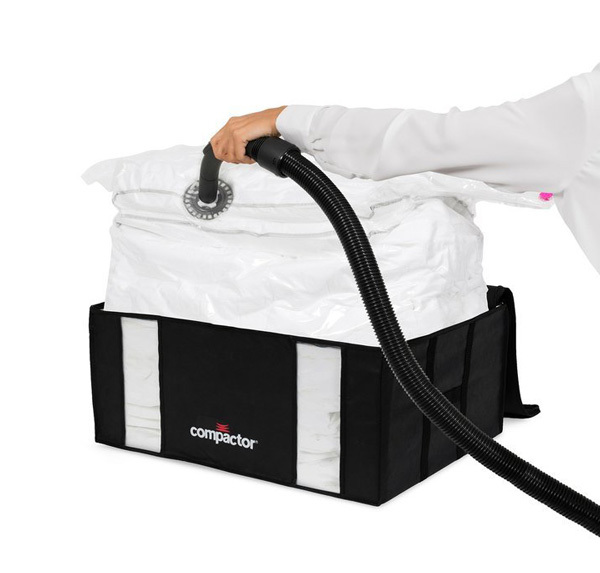 Uspořádejte si věci v domácnosti chytře a úsporně, díky vakuovému pytli ve vyztuženém pouzdře od firmy Compactor, ten Vám umožní ušetřit až 75% místa ve vašich úložných prostorech. Peřiny, závěsy, prostěradla, ubrusy, polštáře, péřové bundy, kabáty...všechno Vaše oblečení a textílie budou ochráněny před prachem, vlhkem a roztoči, tuto dokonalou ochranu garantujeme. Hlavní výhodou kompresního úložného 3D vaku je velká úspora místa. Textilie uskladněné tímto způsobem ušetří 75 % prostoru . Vnitřní vak je vyroben z polymeru s tvarovou pamětí, proto se při opětovném vpuštění vzduchu vrátí do původního tvaru. Jedná se o materiál, který nemění textilní vlákno, což znamená, že pokud do pytle vložíte vyprané a vyžehlené oblečení (doporučujeme), ve stejném stavu ho po dekompresi opět vyndáte. Vnitřní vak je k vnějšímu pouzdru připevněn patentovaným systémem, který zajišťuje dokonalou funkčnost. Inovovaný odsávací ventil je kompatibilní se všemi domácími vysavači (včetně vysavačů Dyson) a je navržen tak, aby zajistil optimální sání. Ventil je pouze jednocestný, proto po odsátí vzduchu nedochází k opětovnému nafouknutí vaku. Úložné vakuové boxy Compactor jsou 100 % hermeticky uzavíratelné , což zajišťuje spolehlivý plastový zip s jezdcem. Svoji roli v dokonalé ochraně hraje také vysoce pevný nylon a polyethylen, ze kterého jsou pytle vyrobeny. Díky těmto vlastnostem jsou uložené textilie chráněné před působením vnějších škodlivých vlivů jako jsou plíseň, vlhkost, roztoči, moli či prach. Vnější pouzdro je navrženo tak, aby uskladněné věci zabraly nejen co nejméně místa, ale aby také dobře vypadalo. Vnitřní vak se po kompresi přizpůsobí tvaru pouzdra a díky tomu je lze také snadno stohovat. Moderní design umožňuje skladovat věci úhledně třeba i na očích. Je vyrobeno z vyztužené netkané textilie a lze ho v případě potřeby ručně vyprat. Obsah pouzdra lze zajistit integrovaným stahovacím popruhem pro snadné skladování i ve vertikální poloze. Pouzdro je po vrchním obvodu opatřeno zipem a praktičnost celému modelu dodávají zesílené rukojeti pro komfortní manipulaci. Transparentní okénka na přední straně zajišťují snadnou identifikaci uložených věcí.