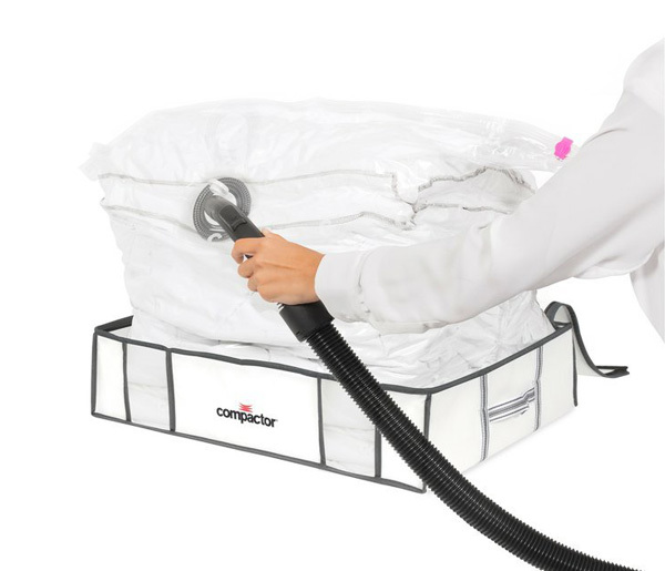 Skladujte věci v domácnosti chytře a úsporně, díky vakuovému pytli ve vyztuženém pouzdře Compactor. Ušetří až 75% místa vašeho úložného prostoru a ochrání všechno vaše oblečení, peřiny i polštáře před vnějšími vlivy jako jsou plíseň, prach či roztoči. Dokonce ani moli už si na vašem šatníku nepochutnají. Hlavní výhodou kompresního úložného 3D vaku je velká úspora místa. Textilie uskladněné tímto způsobem ušetří 75 % prostoru . Vnitřní vak je vyroben z polymeru s tvarovou pamětí, proto se při opětovném vpuštění vzduchu vrátí do původního tvaru. Jedná se o materiál, který nemění textilní vlákno, což znamená, že pokud do pytle vložíte vyprané a vyžehlené oblečení (doporučujeme), ve stejném stavu ho po dekompresi opět vyndáte. Vnitřní vak je k vnějšímu pouzdru připevněn patentovaným systémem, který zajišťuje dokonalou funkčnost. Inovovaný odsávací ventil je kompatibilní se všemi domácími vysavači (včetně vysavačů Dyson) a je navržen tak, aby zajistil optimální sání. Ventil je pouze jednocestný, proto po odsátí vzduchu nedochází k opětovnému nafouknutí vaku. Úložné vakuové boxy Compactor jsou 100 % hermeticky uzavíratelné , což zajišťuje spolehlivý plastový zip s jezdcem. Svoji roli v dokonalé ochraně hraje také vysoce pevný nylon a polyethylen, ze kterého jsou pytle vyrobeny. Díky těmto vlastnostem jsou uložené textilie chráněné před působením vnějších škodlivých vlivů jako jsou plíseň, vlhkost, roztoči, moli či prach. Vnější pouzdro je navrženo tak, aby uskladněné věci zabraly nejen co nejméně místa, ale aby také dobře vypadalo. Vnitřní vak se po kompresi přizpůsobí tvaru pouzdra a díky tomu je lze také snadno stohovat. Moderní design umožňuje skladovat věci úhledně třeba i na očích. Je vyrobeno z vyztužené netkané textilie a lze ho v případě potřeby ručně vyprat. Obsah pouzdra lze zajistit integrovaným stahovacím popruhem pro snadné skladování i ve vertikální poloze. Pouzdro je po vrchním obvodu opatřeno zipem a praktičnost celému modelu dodávají zesílené rukojeti pro komfortní manipulaci. Transparentní okénka na přední straně zajišťují snadnou identifikaci uložených věcí.