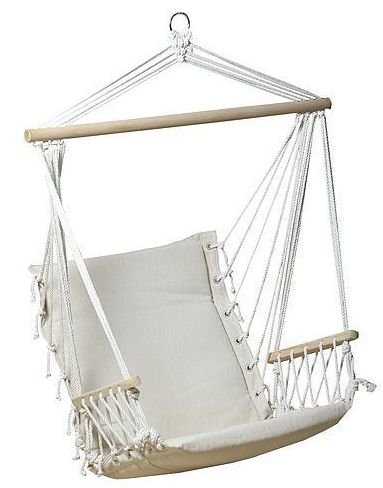 Závěsné houpací křeslo CRAIG s bavlněnou poduškou a dřevěnými opěrkami na ruce. Parametry - nosnost max. 150 kg, šířka sedáku 50 cm, výška po dřevěný rám 100 cm, barva - béžová, hmotnost 2,13 kg.