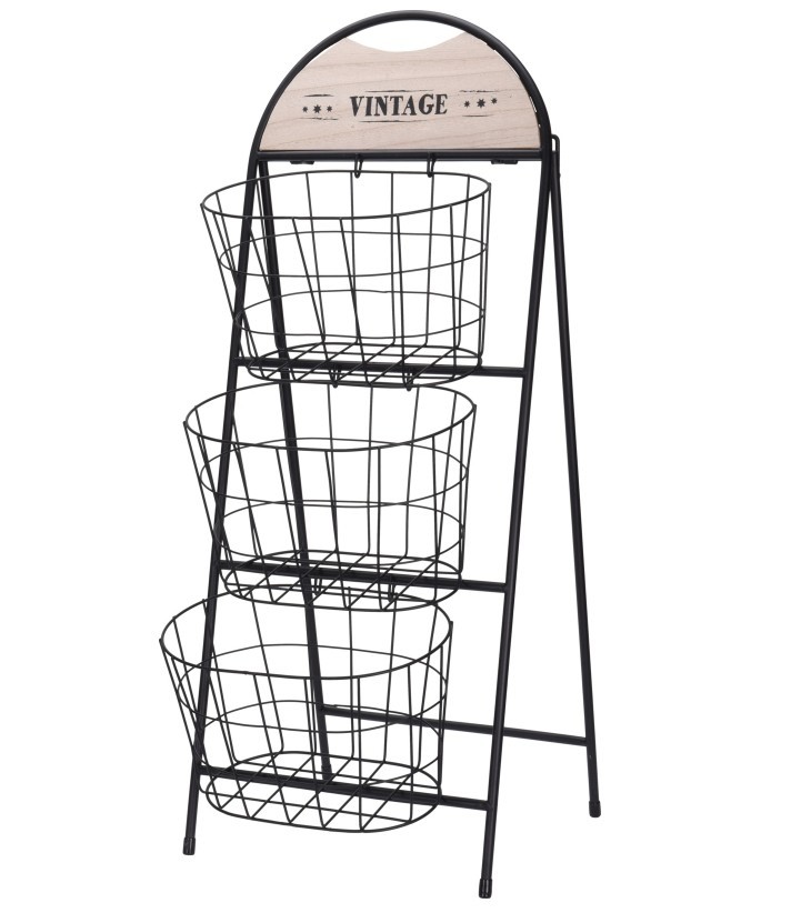 BASKET RACK, 3 METAL BASKETS ON FRAME. TOTAL SIZE 33X70X73CM, SIZE BASKET: 280X195X170MM. ON TOP ON FRAME WOODEN PLATE WITH PRINTED TEXT, BISTRO LOGO. KNOCK DOWN, EACH BASKET WITH PAPER FOR PROTECTION, EACH SET WITH HANGTAG INCLUDING PHOTO AND BARCODE/ 600X335X793MM, Hangtag: 1 X pcs Rack, Metal, 330X270X820MM,3 X pcs Basket, 280X195X170MM,1 X pcs Plate, Wooden / CFT 3,57,(2.801/40ft HQ)
