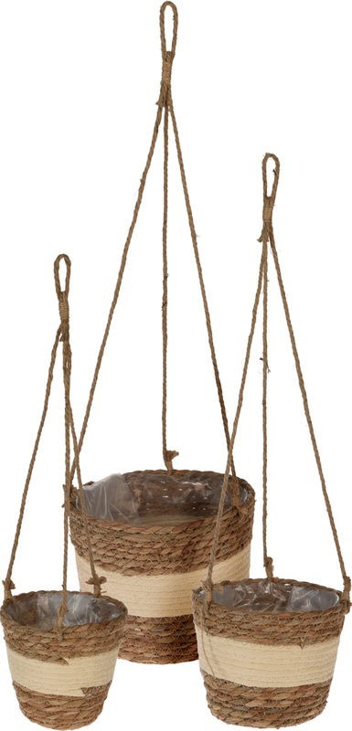 Tato sada obsahuje tři květináče různé velikosti, které jsou ručně pletené z přírodní mořské trávy. Díky tomu vynikají nejen svou krásou a jedinečností, ale také odolností. Každý květináč je vybaven praktickou dlouhou lanovou závěsnou smyčkou, která umožňuje jejich pohodlné upevnění jak v interiéru, tak venku na terase či balkoně. Vnitřní igelitová vložka zajistí, že půda a voda zůstanou vždy tam, kde mají být, a vaše rostliny budou mít optimální podmínky pro růst.