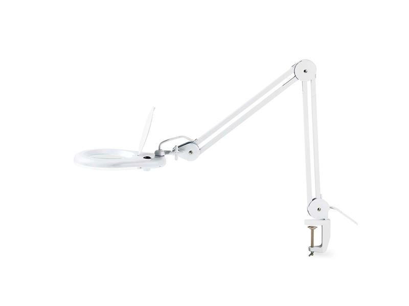 Tato flexibilní Nedis bílá lampa s lupou a svorkou na pracovní stůl disponuje výkonným zvětšením (1,75x) se 3 dioptriemi. Je toho dosaženo použitím skleněné čočky o průměru 120 milimetrů. Díky tomu je tato 9wattová lampa s lupou ideální pro detailní práci s malými díly, jak v práci, tak pro koníčky.Lupa je osvícena 56 diodami SMD LED s intenzitou osvětlení 685 lumenů a teplotou světla 6 500 kelvinů. V horní části je ochranná krytka a světla jsou zakryta průhledným krytem, který zajistí velmi jasné a čisté světlo. Flexibilní otočné rameno může být svorkou připevněno ke stolu nebo jinému povrchu. Délka ramene je 125 centimetrů. To znamená, že si světlo můžete uzpůsobit pro každý druh práce.