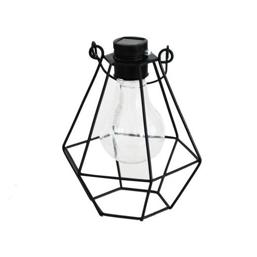 Dekorativní hranatá závěsná nebo stolní lampaMateriál: kov/plastČerná barvaRozměry výška: 14,5 cmRozměry průměr: 11/13 cmTyp zdroje světla: LEDPočet žárovek: 3 LEDBarva světla: Teplá bíláVyměnitelné žárovky: neVypínač: AnoSolární panel: AnoSenzor soumraku: AnoNapájení: 1 x AA NiMH solární dobíjecí - součástí dodávkyAplikační prostor: Venkovní (IP44)
