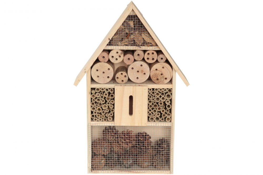 Hmyzí hotel 31 x 10 x 48 cm z jedlového dřeva se střechou a vchodem určený na zahradu nebo terasu. Čtyři patra s přírodním výplňovým materiálem poskytují útočiště různému hmyzu, např. včely, brouci, můry a další. Jednoduše pověsit na slunné místo chráněné před deštěm v blízkosti rostlin nebo stromů. Očko na zavěšení v zadní části domu.