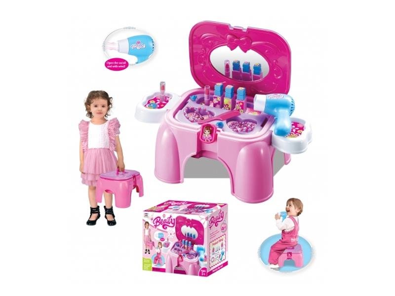 Sedátko s kosmetickým stolkem 2v1 je super doplňkem do každého dětského pokojíčku. Nejen že slouží jako malá židlička, ale po otevření víka na vás čeká překvapení v podobě malého kosmetického studia. Sedátko obsahuje napodobeniny všeho potřebného v kosmetickém salonu, jako jsou rtěnky, šminky, fén, zrcadlo, hřeben, laky na nehty, odkládací prostory, háčky a další doplňky. Složení zpátky do sedátka je velice snadné a trvá jen chviličku. Tuto zábavnou a zároveň praktickou hračku si vaše děti zaručeně oblíbí.
