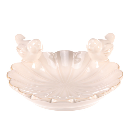 Čistě bílé keramické pítko pro ptáčky ve tvaru pravidelného květu je nádhernou dekorací, která přitahuje pozornost nejen ptáčků, ale i všech kolemjdoucích a návštěvníků. Dva pěvci sedící na okraji pítka dodávají celému pítku hravý a veselý vzhled. Příjemně oživí vaši zahradu a stane se oblíbeným místem pro vaše opeřené návštěvníky, kteří se k vám tak budou rádi vracet.