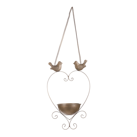 Potěšte sami sebe i své ptačí návštěvníky pořízením závěsného krmítka z kovu v měděné barvě. Díky řetízku jej snadno ihned zavěsíte na místo určení. Samotné krmítko je ve tvaru misky, která je upevněna ve spodní části ozdobného rámu ve tvaru srdce. Na hodní straně rámu sedí dva nedočkaví pěvci. Získáte tím unikátní ozdobný prvek pro zahradu, terasu nebo jiné vhodné místo s praktickým využitím. Miskou plnou dobrot přilákáte k sobě spoustu ptáčků, kteří by k vám jinak nezavítali, a tím skvěle oživíte prostor okolo domu či na zahradě. Závěsné krmítko poskytuje i velkou míru bezpečí pro vaše opeřené strávníky, neboť na ně ze země jen tak něco nezaútočí.