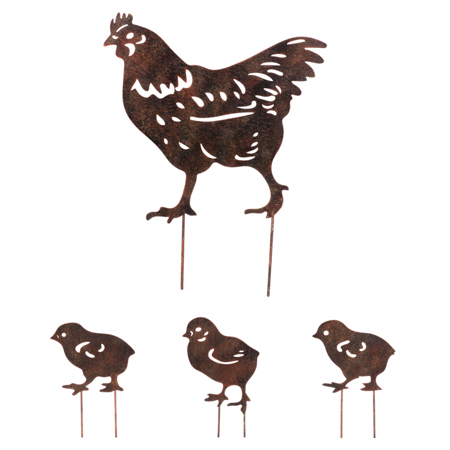 Tato jedinečná sada zahradních kovových zápichů v podobě slepice se třemi kuřátky v měděné až narezavělé barvě je skvělým prostředkem, jak oživit a ozdobit váš venkovní prostor. Můžete je snadno umístit na záhony, nechat vyniknout ve volném prostoru, nebo ozdobit okolí květin, či keřů. Zaberou poměrně málo místa, a přitom budou výraznými body, které jen stěží někdo přehlédne. Kovová konstrukce zajišťuje trvanlivost a odolnost vůči povětrnostním vlivům, což znamená, že tyto dekorace můžete nechat venku prakticky po celý rok. Tyto zápichy vnesou do vaší zahrady nejen zajímavý zvířecí prvek, ale také osobitý charakter, a budou výrazným bodem vaší celkové kompozice.