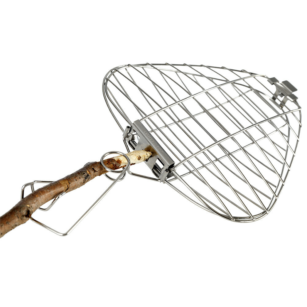 Skladací rošt na grilovanie Light My Fire Grandpa\'s Firegrill vyrobený z nehrdzavejúcej ocele, možno ľahko uchytiť na vetvu a medzi jeho oceľové diely vložiť čokoľvek na opekanie.