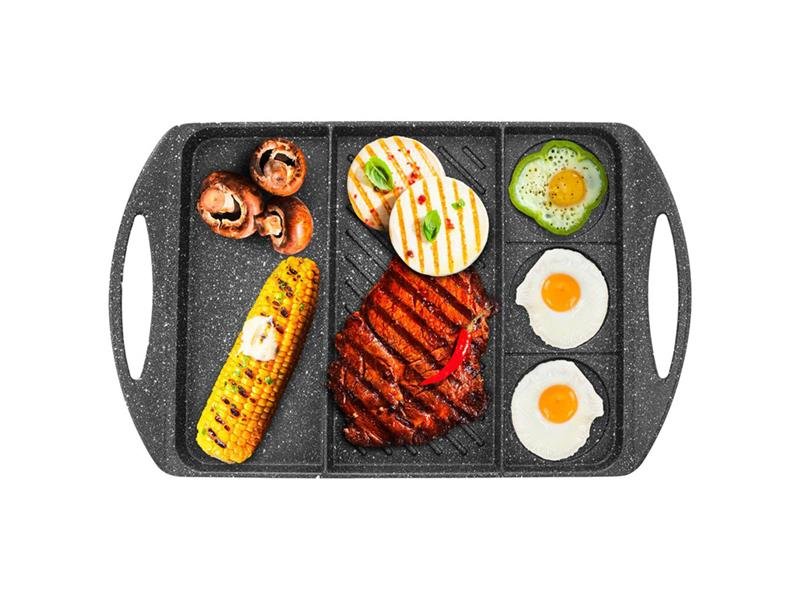 Deska na grilování s uchy je dělená a má velmi kvalitní nepřilnavý povrch PFLUON GRANIT, na kterém připravíte výborné steaky, zeleninu a volská oka s minimální potřebou tuku. Grilovat můžete maso, zeleninu, ryby, uzeniny, vajíčka... Materiál: hliník s vynikajícím nepřilnavým povrchem PFLUON GRANIT a s profilovaným dnem. Rozměry: 42x27x5,5 cm, grilovací plocha 33x26 cm. Lze mýt v myčce na nádobí. Vhodná na všechny typy spotřebičů včetně indukce, vhodná i do trouby a na grily. Doporučujeme použití kuchyňských chňapek. Nikdy grilovací desku nevkládejte přímo do plamenů ohně, mohlo by dojít k deformaci či jinému poškození výrobku - nemůže být v takovémto případě předmětem reklamace! Desku umístěte nad plameny, popř. žhavé uhlí na grilu apod.