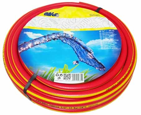 Zahradní hadice červená - žlutý pruh 3/4" - 25m Výrazný design eliminující možnost zničení hadice při sekání trávy. Vyztužená vysokopevnostním PES vláknem. Svou konstrukcí je určená pro všeobecné použití. Vzhledem k vyšší tloušťce stěny má výborné mechanické vlastnosti - odolná proti deformaci.Neprůhledná vnitřní vrstva zabraňuje tvorbě řas.Pracovní tlak: max.12 Bar