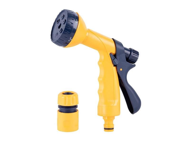 Zavlažovací multifunkční pistole Garden má až 8 nastavitelných funkcí stříkání, a to: sprcha, kužel, plochý, úhel, plný, centrální, mlha a tečení, takže si můžete nastavit různou intenzitu polévání. V balení naleznete pistoli a 1/2" spojku.