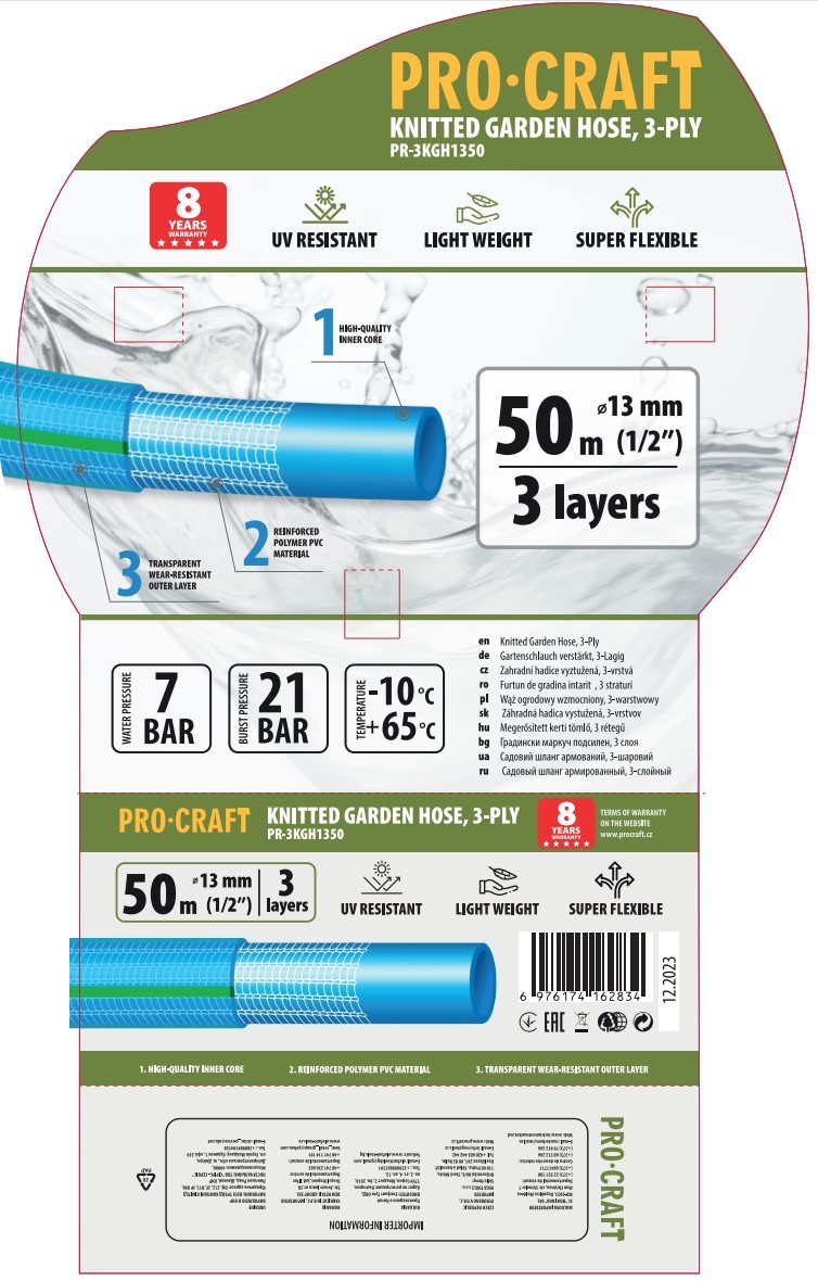 Zahradní hadice Procraft je určena k zalévání a zavlažování zahrad, pozemků. Zesílená třívrstvá zahradní hadice s tkanou výztuhou má vysokou životnost až 8 let. Kvalitní zpracovaní hadice zajišťuje vysokou odolnost UV záření, povětrnostním vlivům a proti teplotám (-10 až +65). Hadice je velmi flexibilní, robustní a odolná proti zlomení.