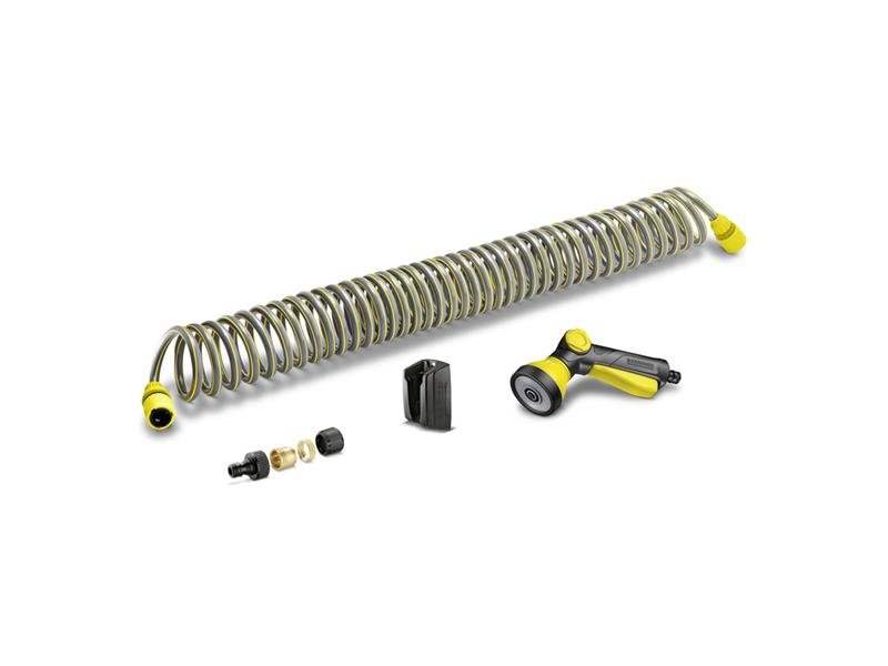 Hadice zahradní KÄRCHER 2.645-178.0 Sada spirálové hadice Kärcher nabízí ideální předpoklady pro pravidelné zavlažování v malých zahradách, na terasách, balkonech nebo při kempování. Již není nutné žádné zdlouhavé a namáhavé nošení zalévacích konví nebo tahání zahradních hadic. Sada spirálové hadice Kärcher je tím pravým pomocníkem a vždy připravena na všechny možné typy zavlažování. Vybavení: 10 m spirálová hadice neobsahující ftaláty, odolná proti UV záření, multifunkční postřikovací pistole, 1 x spojka pro spirálovou hadici s ochranou proti zlomení, 1 xspojka pro spirálovou hadici s ochranou proti zlomení a Aqua Stopem, kohoutová přípojka G3/4, kohoutová přípojka pro vnitří armatury a držák na stěnu. S pomocí sériově dodávané multifunkční postřikovací pistole lze snadno odstranit i hrubé nečistoty ze zahradního nářadí. Spirálová hadice získá po každém použití zpět svůj kompaktní tvar a může být úsporně uložena na držáku