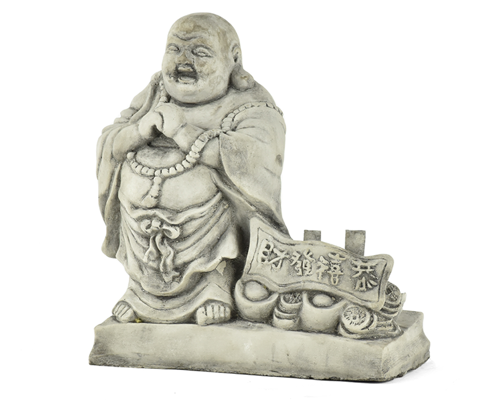 Zahradní betonová dekorace - Buddha Hotei s ingoty a mincemi štěstí