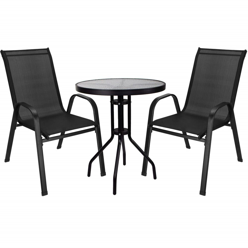 Elegantní balkonový / terasový set - kulatý stůl + 2 židle - skvěle doplní venkovní posezení. Zaoblené hrany, estetické reliéfní sklo s hladkým povrchem, pohodlné stohovatelné židle s vysokým opěradlem a širokými područkami. Textilní podsedák židlí je prodyšný a neabsorbuje vlhkost. Set zaujme kvalitním zpracováním a antikorozním lakováním pro dlouhou životnost. Průměr stolu 60 cm, nosnot stolu 60 kg / židle 100 kg.