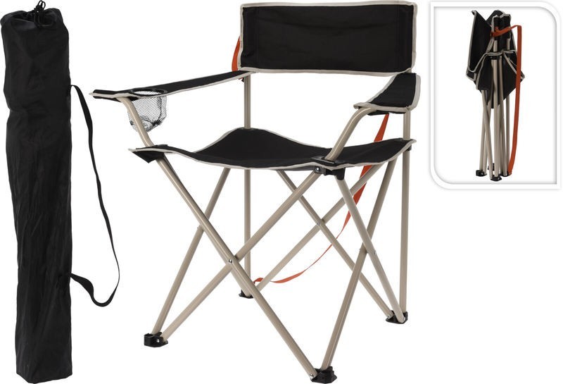 CAMPING CHAIR FOLDABLE, SIZE:81/54X46/82CM. TUBE DIA 19X0.9/1MM ALU IN CREAM COLOR. FABRIC IN BLACK WITH CREAM IN 600X300D POLYESTER. WITH ORANGE CARRYING CORD AND MESH CUPHOLDER IN ARMREST. PACKING PER PIECE IN 210D CARRY BAG. WITH SEWN ON LABEL WITH OUR ARTWORK. SIZE LABEL 150X200MM/ CARRY BAG, 845X130X130MM, Pouch with hanglabel / CFT 3,34,(4.470/40ft HQ)