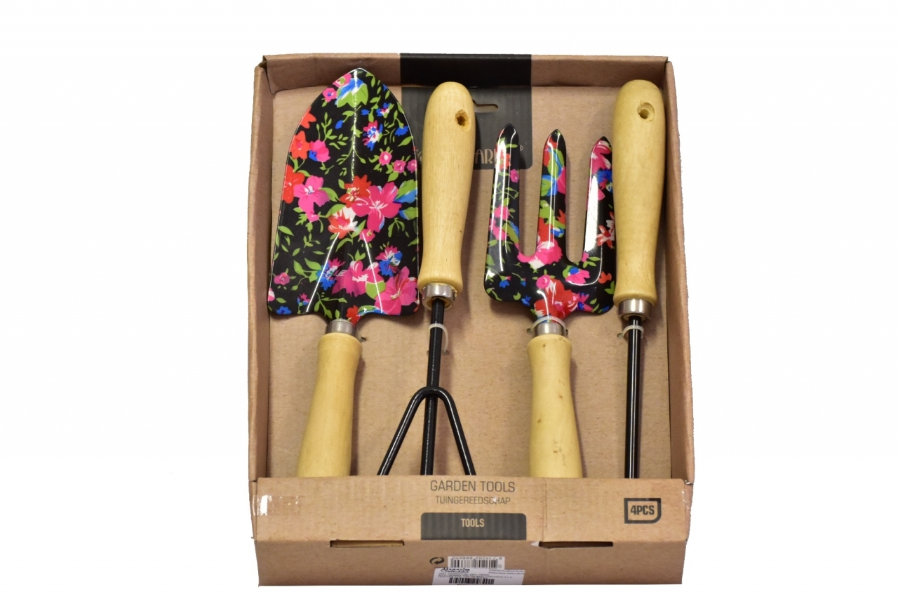 Lopatka, kultivátor, škrabka na plevel, hrabičky. Vše je uloženo v dárkové krabičce.