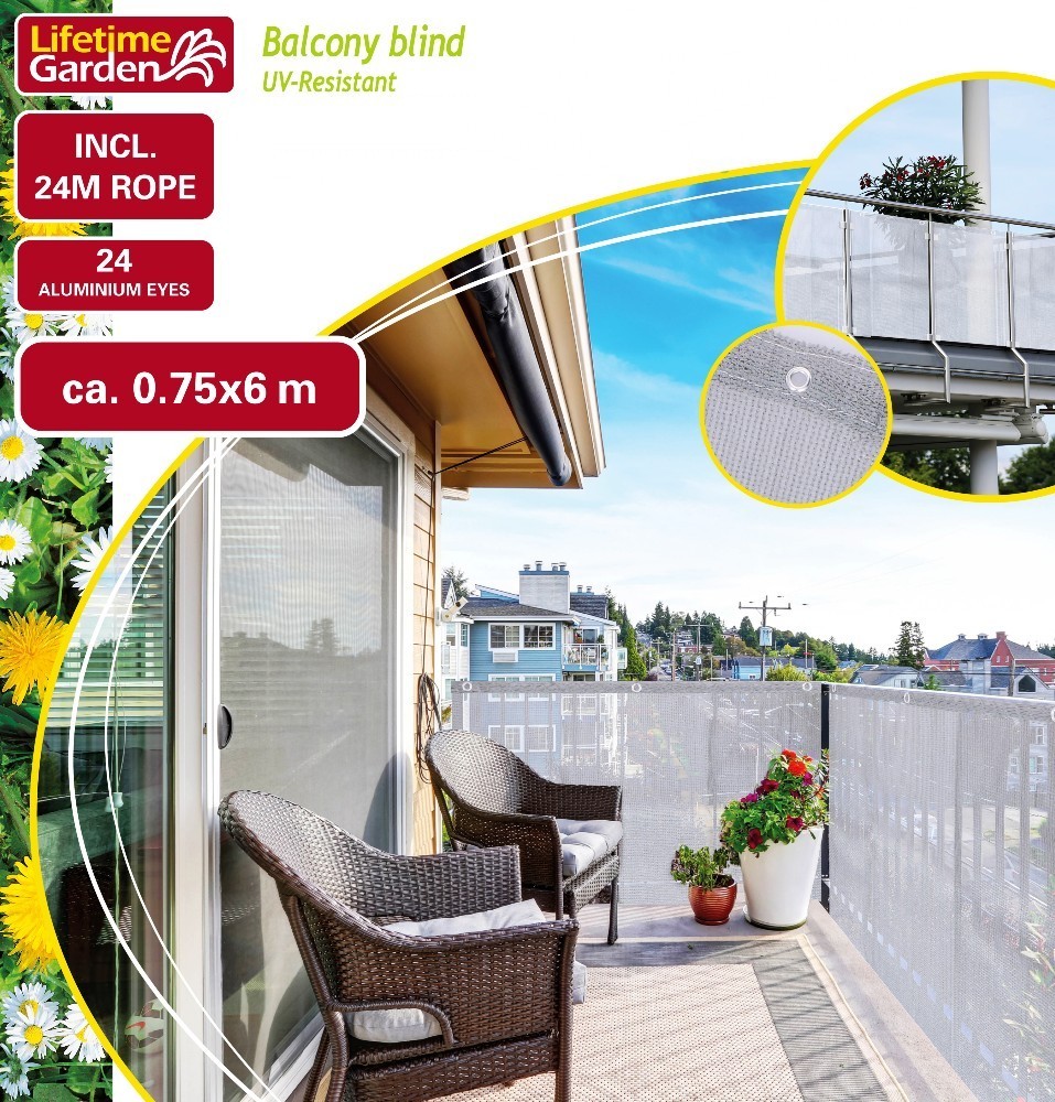 Užíváte si svůj balkon v hezkých dnech bez obav ze škodlivého UV záření a zvědavých očí? To je možné s balkonovým slunečníkem Lifetime Garden v šedé barvě. Balkonová zástěna vám nabízí další soukromí a závětří vašeho balkonu, které si můžete užívat. Je 75 centimetrů vysoká a 6 metrů dlouhá. Vyrobena je ze syntetické tkaniny odolné proti UV záření (120g/m2 polyethylen) s tkanou strukturou, takže vás v teplých dnech ochladí lehký vánek. Zástěnu zavěsíte na okraj vašeho balkonu tak, že provlečete přiložené 24 metrů dlouhé lano 24 hliníkovými oky v látce.