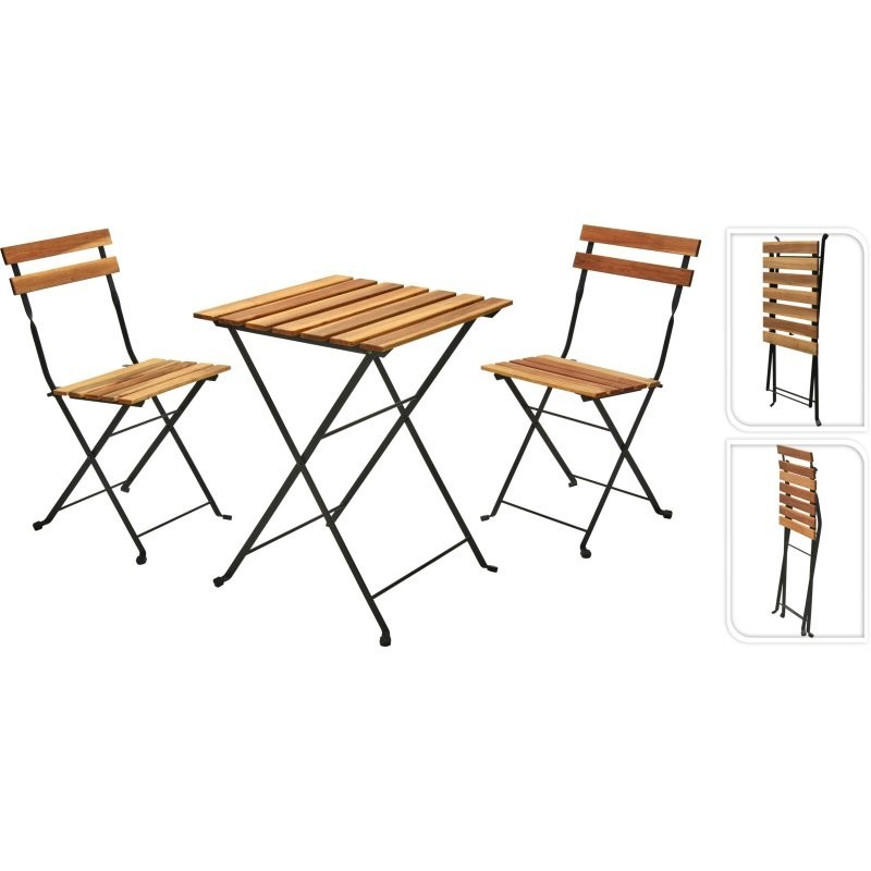 BISTRO SET OF 3PCS, 100 PERCENT ACACIA WOOD (MANGIUM) IN TEAK LOOK, WITH BLACK STEEL FRAME. 2X FOLDING CHAIR SIZE 39X44XH79CM AND 1X FOLDING TABLE SIZE 55X54XH71CM. EACH SET PACKED IN 5-LAYER BROWN CARTON BOX WITH BLACK PAINTING AND WITH A4 COLOUR LABEL AT ONE SIDE, CARTON BOARDS BETWEEN PCS TO PROTECT THE GOODS../ 935X585X150MM, Brown box/colour label corrugated (BBCL): 2 X pcs Chair folding, Steel/Acacia, 440X390X790MM,1 X pcs Table folding, 550X540X710MM / CFT 2,90,(855/40ft HQ)