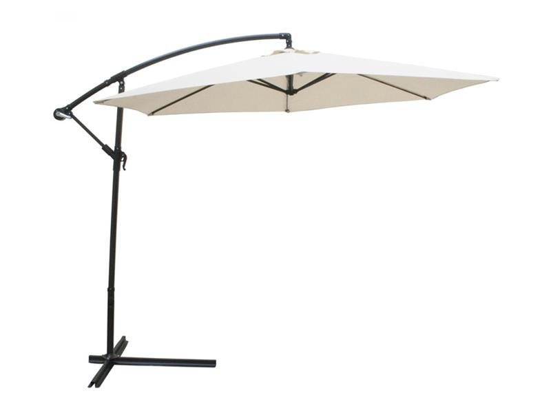 Závěsný slunečník průměr 300 cm má 6 ocelových žeber 12 x 18 mm, je vyrobený z polyesteru 160 g / m2. Pevná ocelová tyč má průměr 4,8 cm. Stojan, který je součástí výrobku je možno zatížit betonovými dlaždicemi pro zvýšení celkové stability. Otevírání slunečníku se provádí kličkou. Navíjecí systém má plastové pouzdro s kovovým navíjecím mechanismem - kovová klička, kovová hřídel a kovový pastorek s kovovou závlačkou. Barva béžová.