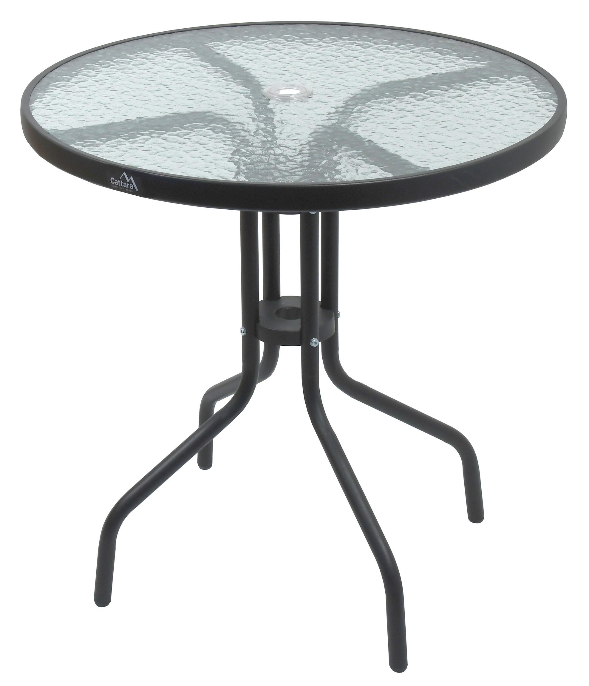 Kulatý stůl TERST s tvrzenou sklěněnou deskou opatřenou otvorem pro slunečník je ideální doplněk na zahrady, altánky, ale i balkony. Stůl je opatřen čtyřmi nohami, které zvýšují stabilitu, jejich konstrukce navíc zajišťuje umístění slunečníku pro horké letní, ale i deštivé dny. Plocha stolu je tvořena tvrzeným sklem se vzhledným designem. Sklo je opatřeno kovovým obvodovým prstencem. Průměr stolu je 70 cm a deska je umístěna ve výšce 72 cm.