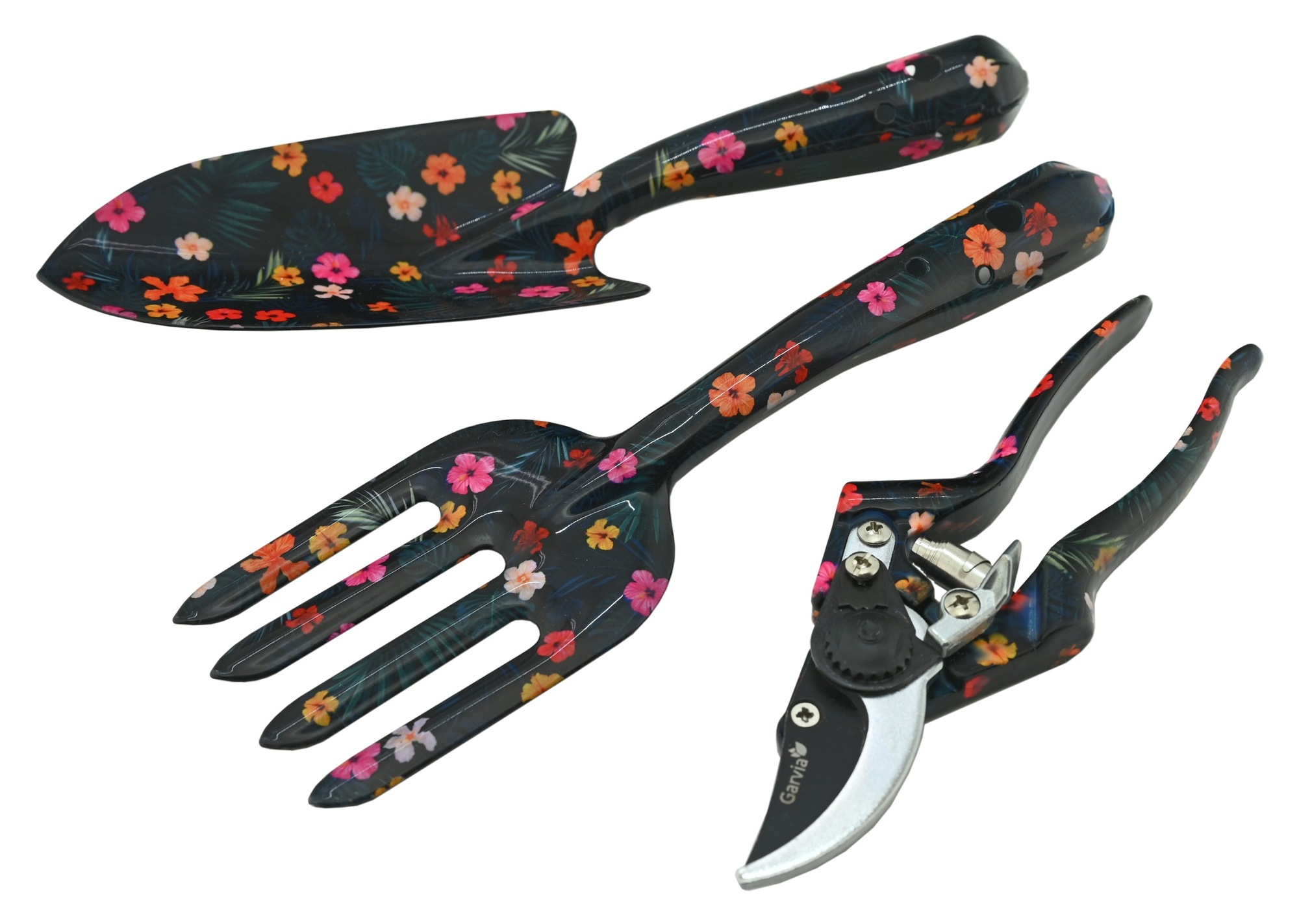 Stylová sada zahradního nářadí DARK FLOWERS kombinuje elegantní květinový design s vysokou funkčností pro snadnou práci na zahradě. Sada obsahuje lopatku, vidlicový kultivátor a zahradní nůžky, což z ní činí ideálního pomocníka pro sázení, kypření půdy a údržbu rostlin.