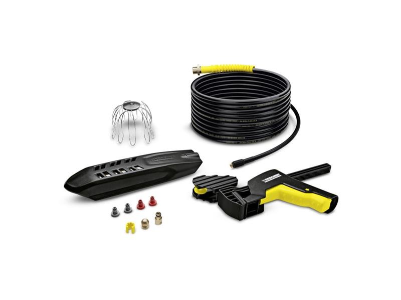 2 v 1 - chytřejší řešení pro čištění okapů a ucpaného potrubí, popř. vedení odpadních vod! Inovativní sada Kärcher na čištění okapů a potrubí pracuje za vás - s vysokým tlakem. Pohybuje se samostatně na pojezdovém vozíku okapem bez toho, aby uživatel musel neustále stát na žebříku vedle okapu. Tato sada na čištění okapů a potrubí je vybavena dvěma různými tryskami: tryskou na čištění potrubí s čtyřmi dozadu namířenými vysokotlakými paprsky a tryskou na čištění okapů pro montáž hadice na pojezdový vozík. Rychlé přepínání mezi aplikacemi je možné kdykoliv. Ochrana hadice proti ohnutí a mosazná přípojka zaručují dlouhou životnost. Délka hadice je 20 m. Sada na čištění okapů a potrubí je vhodná pro vysokotlaké čističe z hobby řad K2-K7.