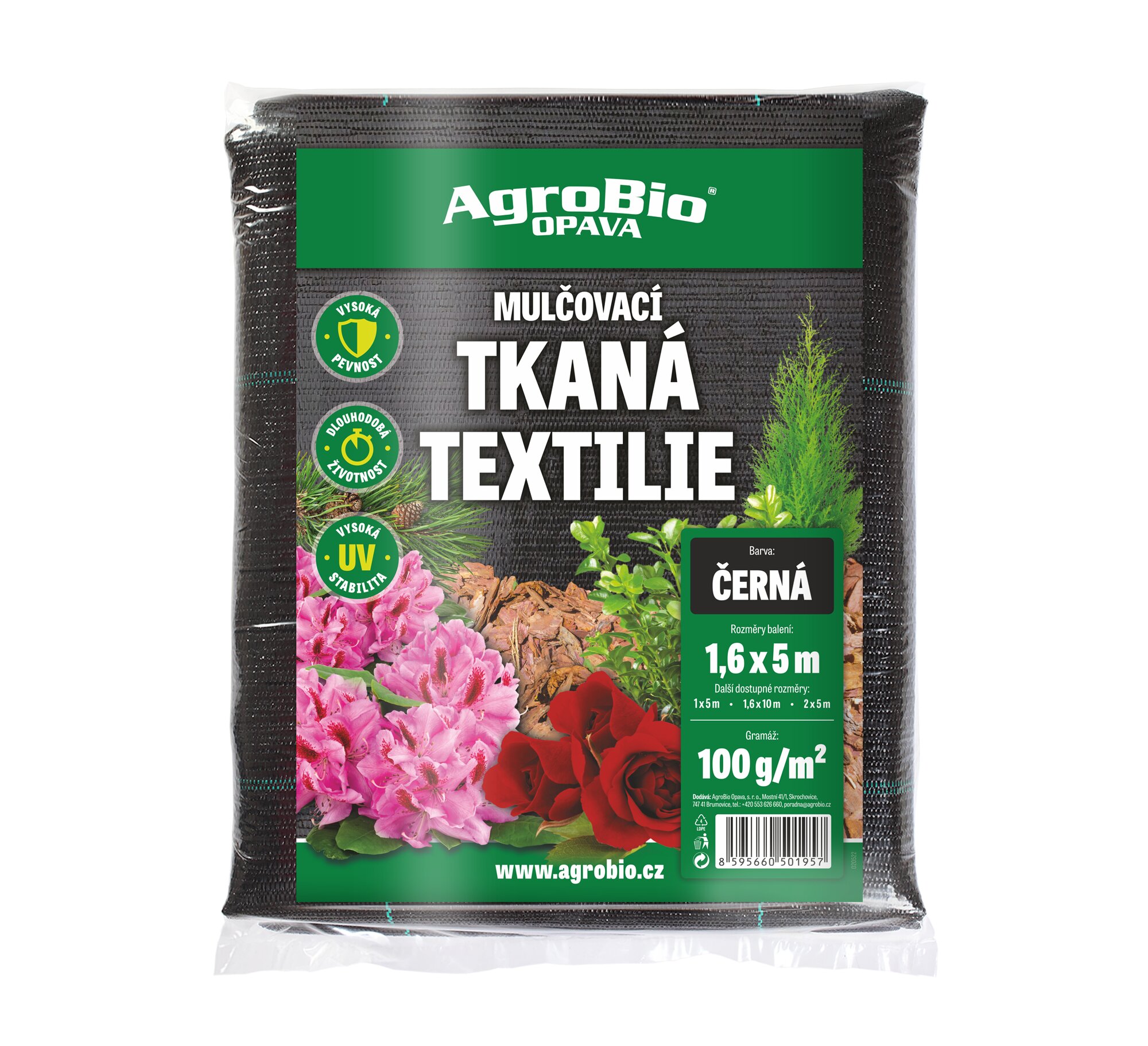 Mulčovací tkaná textilie - černá. Vlastnosti: 100 g/m2, velmi odolná proti UV záření. Má vysokou pevnost a dlouhodobou životnost. Zamezuje nadměrnému výparu vody z půdy, zabraňuje prorůstání plevelů a znečištění plodů či rostlin od zeminy. Textilie se používá jako podkladová textilie pod dekorační materiály jako jsou mulčovací kůra, štěpka či oblázky při výsadbě okrasných rostlin, stromů a keřů.