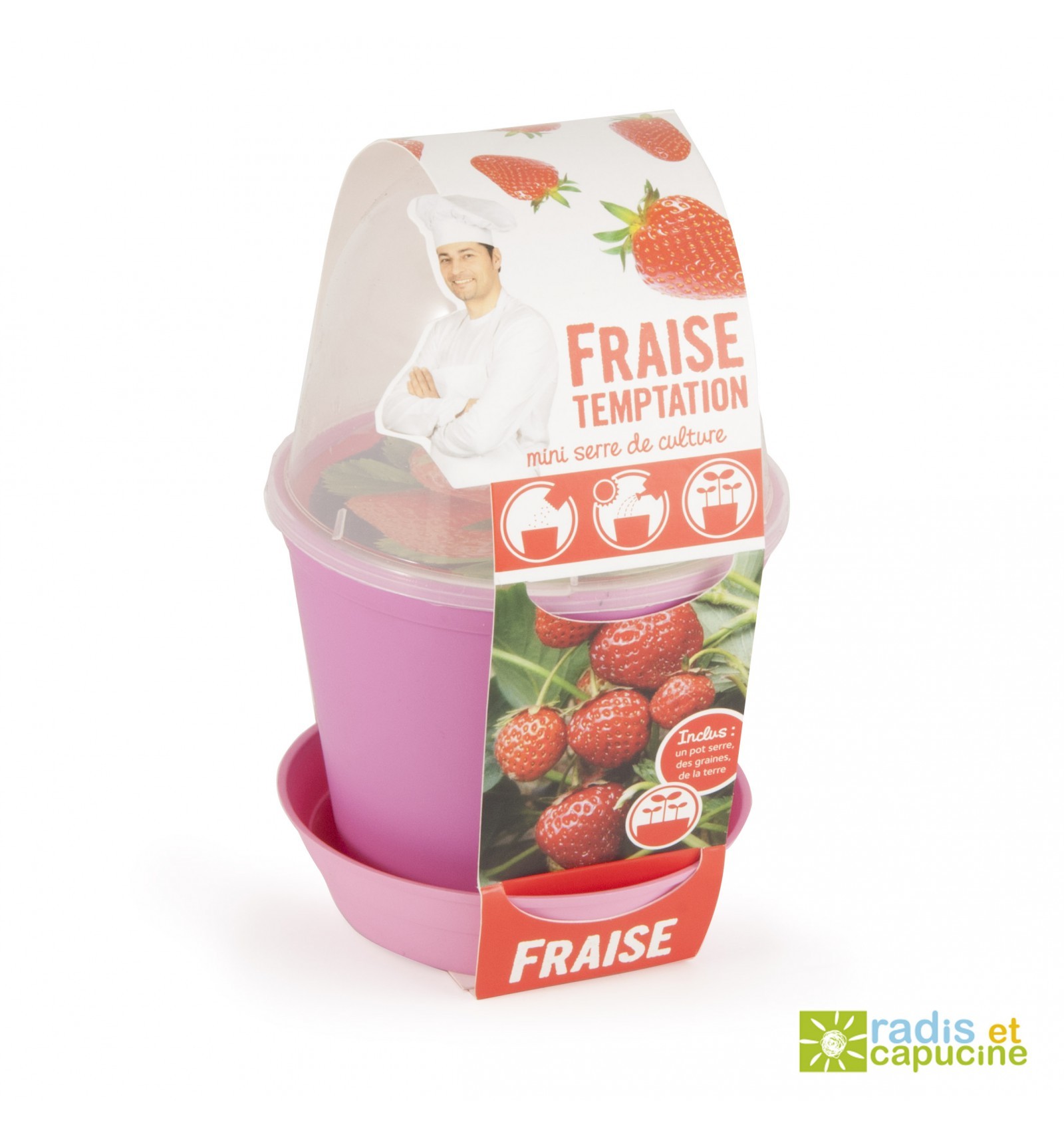 Zábavná zahrádka - Květináč Bell s jahodami Vytvořte si doma vlastní mini zahrádku! Produkty Radis et Capucine jsou ideálním způsobem, jak nejen dětem přiblížit záhady růstu a pěstování plodících rostlin a bylinek. Pro vypěstování je k dispozici stlačený instantní substrát s kokosovými vlákny a kvalitní organická semena. Substrát po nabobtnání vyplní květináč tak, aby se zaručily ideální podmínky pro klíčení a růst rostlin. Pěstování je díky instantnímu substrátu a organickým semenům velmi jednoduché. Jak pěstovat rostliny v květináči Bell? Po rozbalení květináče zalijeme instantní substrát sklenicí nejlépe teplé vody (pro rychlejší nabobtnání do požadovaného objemu) a poté necháme vychladit. Substrát by měl být kyprý po celém objemu, v případě potřeby přilejte ještě vodu nebo přebytečnou vodu odstraňte. Semena vysejeme rovnoměrně na povrchu substrátu a nechame je naklíčit. Pro zajištění lepšího výsevu, můžeme semena smíchat s malým množstvím písku. Pravidelně povrch substrátu se semeny zvlhčujte (nezaléváme, proud vody by semena vyplavil). Víko květináče slouží jako skleník - urychluje klíčení semen, koncentruje potřebné světlo a udržuje vlhkost. Po naklíčení rostlin zasadíme klíčky do substrátu asi 1-2 cm pod povrch. V případě velkého množství naklíčených semen přebytečné klíčky odstraňte tak, aby měly rostliny dostatek místa pro růst. Pak už jen rostlinky zaléváme, v případě plodících rostlin sklízíme. Francouzská značka Radis et Capucine
