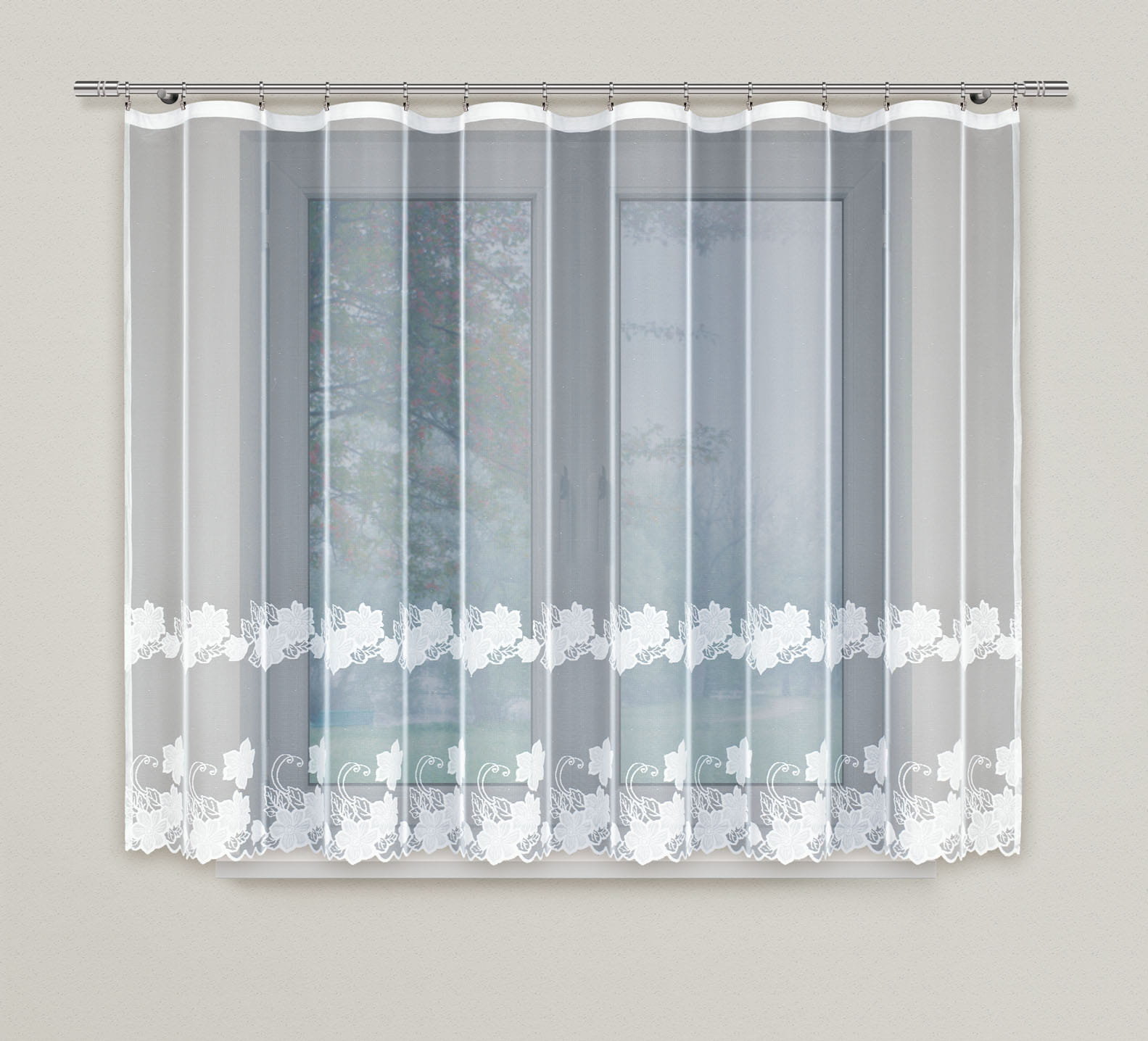 Kvalitní žakárová hotovádekorační záclona s řasící páskou v moderním provedení do kuchyně nebo obývacího pokoje v rozměru 300x180 cm. Záclona je připravena na zavěšení na žabky nebo háčky. 1 kus v balení. Záclona má řasící pásku 3,5 cm.