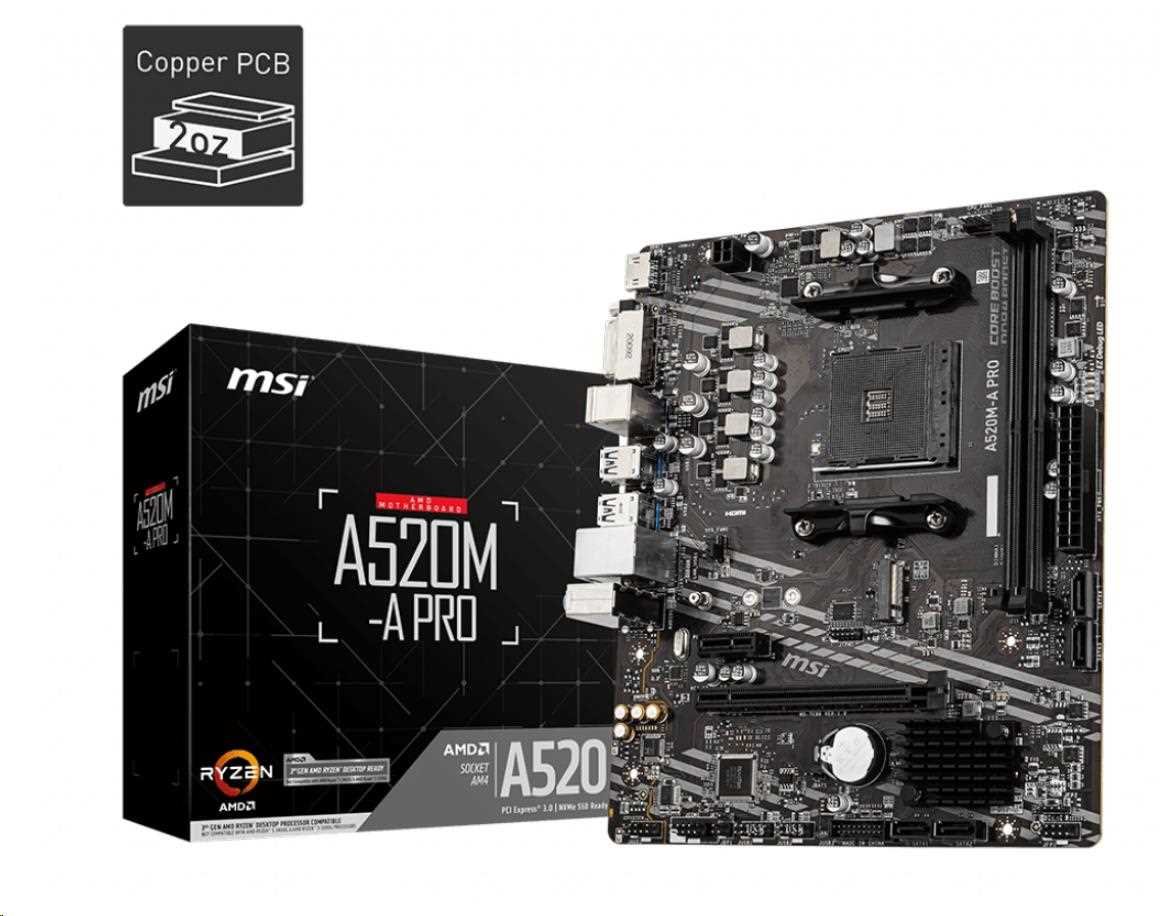 Box Content | A520M-A Pro Quick Installation Guide MSI Case Badge 2x SATA Cables Product Registration Card I/O Shielding Driver DVD |