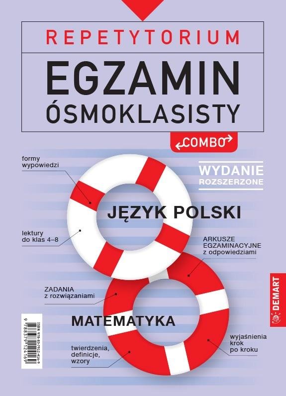 Combo egzaminacyjne służy przygotowaniu ósmoklasisty do obowiązkowego egzaminu na zakończenie szkoły podstawowej. Zawiera materiał z języka polskiego i matematyki opracowany według założeń nowej podstawy programowej. Jest to więc obowiązkowy zasób egzaminacyjny dla każdego ucznia (język obcy można wybierać). Combo egzaminacyjne to repetytorium, z którego może korzystać sam uczeń, a także może posłużyć do przygotowania się, np. z nauczycielami a nawet rodzicami, do powtórzeń, klasówek i sprawdzianów w trakcie całego czteroletniego cyklu nauki w szkole podstawowej. Język polski podzielono na zagadnienia gramatyczne (28 tematów) i pozostałe obejmujące: omówienie lektur, informacje o twórcach, formy wypowiedzi (65 tematów). Materiał z matematyki opracowano w ramach 34 tematów. Każdy temat został opracowany w ten sposób, by podać wszystkie niezbędne informacje, przykłady stosowania oraz pytania sprawdzające z odpowiedziami. Ważnym elementem tego opracowania jest fakt, że materiał tak został podzielony by cały temat był widoczny na dwóch sąsiadujących ze sobą stronach (tzw. rozkładówkach), czyli uczeń może objąć go w całości wzrokiem. Dzięki temu zabiegowi uczeń z łatwością zauważy wyróżnione elementy i zagadnienia, zapamięta je i wykorzysta, gdy zajdzie taka potrzeba. W przypadku matematyki są to zadania z rozwiązaniami krok po kroku, dodatkowo skomentowanymi. Chodzi o to by uczeń poznał ogólne schematy, które można zastosować w poszczególnych typach zadań. W ostatniej części znajdują się testy egzaminacyjne z 2019 z odpowiedziami i wyjaśnieniami jakie przeprowadzić rozumowanie i obliczenia by uzyskać właściwy wynik (matematyka) lub by napisać czy też przeanalizować teksty, rozpoznać lub podać odpowiednie formy gramatyczne wymagane w pytaniu (język polski). W tej części znajdują się też odniesienia do właściwych tematów, gdzie są szczegółowe objaśnienia potrzebne do wykonania pytań/ zadań egzaminacyjnych. Istotną rolę odgrywa grafika tego opracowania, która wydobywa najistotniejsze treści, pomaga zauważyć i zapamiętać różne stałe elementy po prostu porządkuje przekaz.