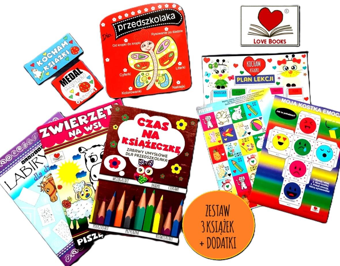 DLA PRZEDSZKOLAKA ZESTAW 3 KSIĄŻEK Z DODATKAMI Super zestaw 3 książek dla dzieci w wieku przedszkolnym. W zestawie następujące książki: ULUBIONE LABIRYNTY DLA DZIECI ZWIERZĘTA NA WSI. TO LUBIĘ! CZAS NA KSIĄŻECZKĘ. ZABAWY UMYSŁOWE DLA PRZEDSZKOLAKA W zestawie dodatkowo znajdują się naklejki, gra...