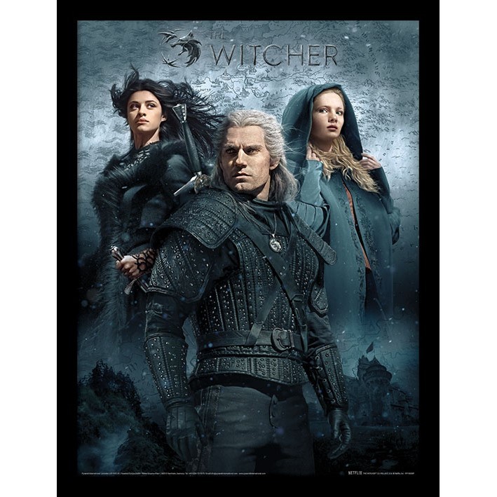 Zarámovaný obraz s hlavními hrdiny seriálu Zaklínač od Netflixu - s Geraltem z Rivie, čarodějkou Yennefer a Ciri, Lvíčetem z Cintry. Pěkný dárek pro fanoušky zaklínačských příběhů!
