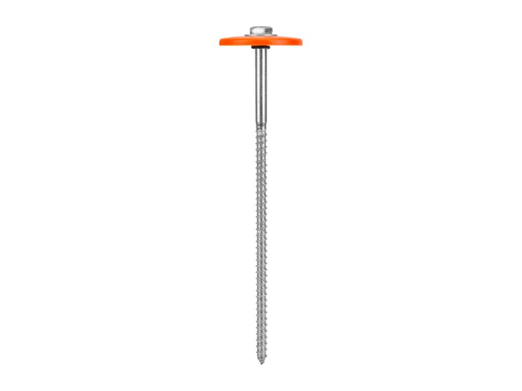 Kotvící kolík farmářský, kovový, 300mm, se závitem, 1ks BRADASKotvící kolík, kovový v délce 300 mm, se závitem, velikostí hlavy 13 mm a plastovou kulatou krytkou o průměru 50 mm, vhodný pro uchycení velkých plachet na stohy balíků slámy, sena, dále krycích plachet, stanů, přístřešků...