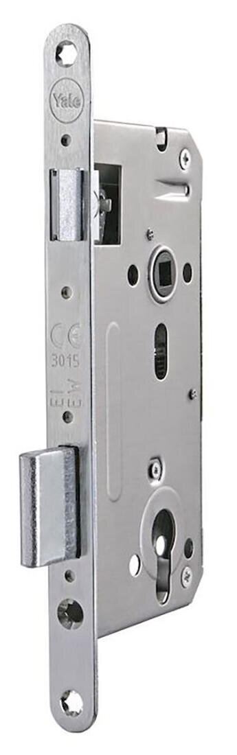 Mechanický zadlabací zámek ovládání cylindrickou vložkou - dvouzápadový, levý/pravý- protipožární provedení- ovládání přes cylindrickou vložku- zámek s převodem (střelku lze ovládat přes cylindrickou vložku)- otvory v bočních deskách o průměru 7 mm umožňují použití dvoudílného kování (rozetové) - přeměnu zámku z pravého na levý a naopak umožňuje dělená střelka. Povolením příslušného šroubu se hlava střelky uvolní, vysune, otočí o 180°, nasune zpět na vodítko střelky a šroubem se utáhne- oválný otvor v krycí i základní desce o průměru 9 mm umožňuje použití bezpečnostních štítů- protipožární provedení zámku je dle normy EN 12209 certifikováno v BT3Rozměry v mm. Rozteč Backset Hloubka zádlabu Šířka čela Požární odolnost90 50 80.5 22 NE