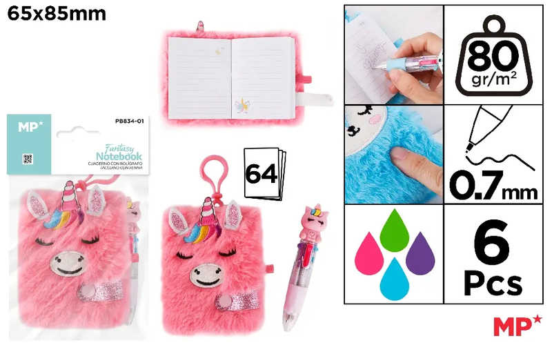 Notes pluszowy z kolorowym długopisem mini 4w1 0,7mm, Unicorn, Main Paper