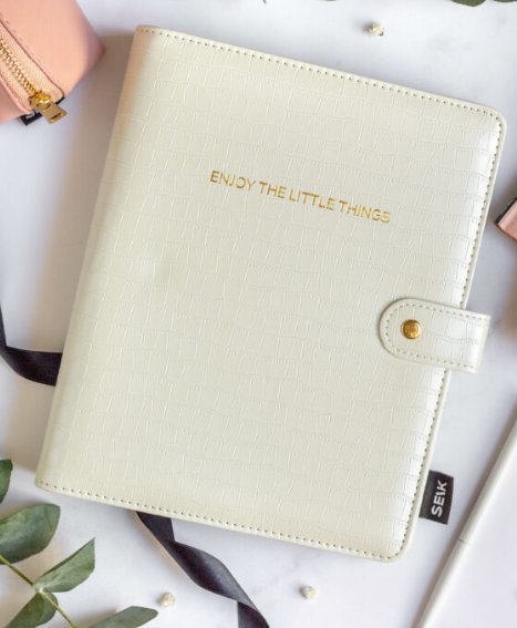 Tento vegánsky kožený krúžkový zakladač je štýlový a elegantný so zlatými detailmi. Vo vnútri nájdete vrecká na doklady a karty, vďaka ktorým je všetko usporiadané. Obsahuje aj držiak na pero. Kožené poťahy sú navrhnuté pre dlhú životnosť a jednoducho potrebujú každý rok nové vložky.