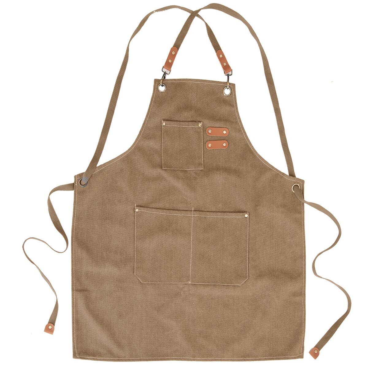 Kuchyňská zástěra ochrání oblečení při vaření, přípravě jídla v kuchyni nebo grilování na terase. Mohou ji ale využít také barmani, obsluha v kavárně, kutilové... Popruhy se kříží za zády a v pase jsou na zavázání. Dále je zástěra vybavena dvojitou kapsou na břiše, menší kapsou na prsou a dvěma poutky, kam se může zasunout vařečka, tužka nebo jiný pomocník. Materiál: canvas (65 % polyester + 35 % bavlna), koženka, kov, bavlna + len (vázací šňůra). Rozměry: š. 68 cm, d. 74 cm. Lze prát v pračce na 30 °C, nepoužívat bělidlo.