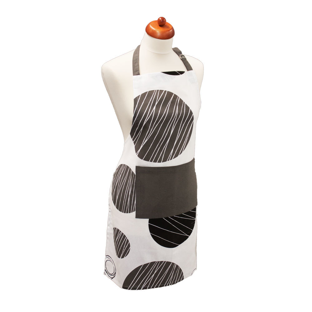 Kuchyňská zástěra s motivem kruhů v decentní černobílé kombinaci. číst celé