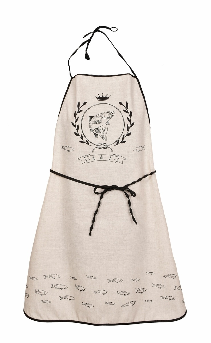 Praktická zástěra s dekorem ryb na béžovým podkladu působí velice vkustě a moderně.