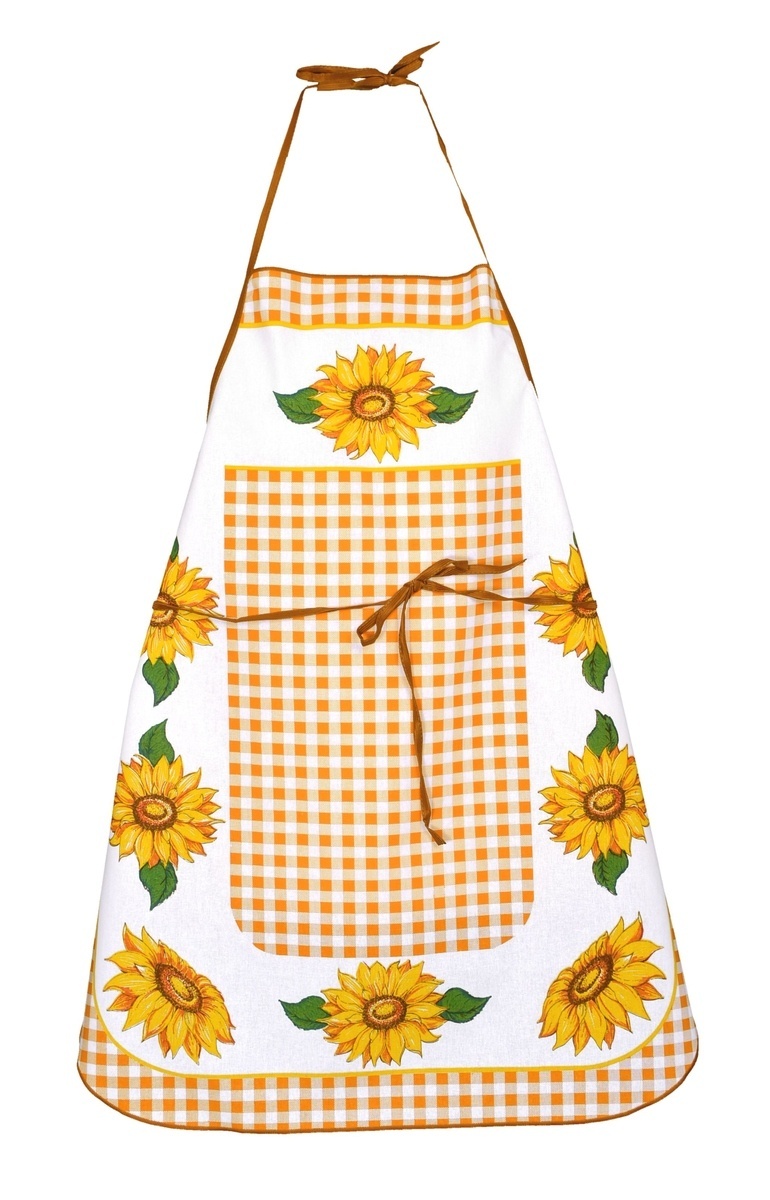 Praktická zástěra v dekoru slunečnic a kára působí příjemným, veselým dojmem.