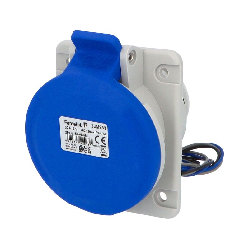 Zásuvka vestavná 23M233 IP44-54/230V/32A/3P 6h, šikmá 10°, mikrospínač - SpeedPRO. Příruba 75x85 mm.