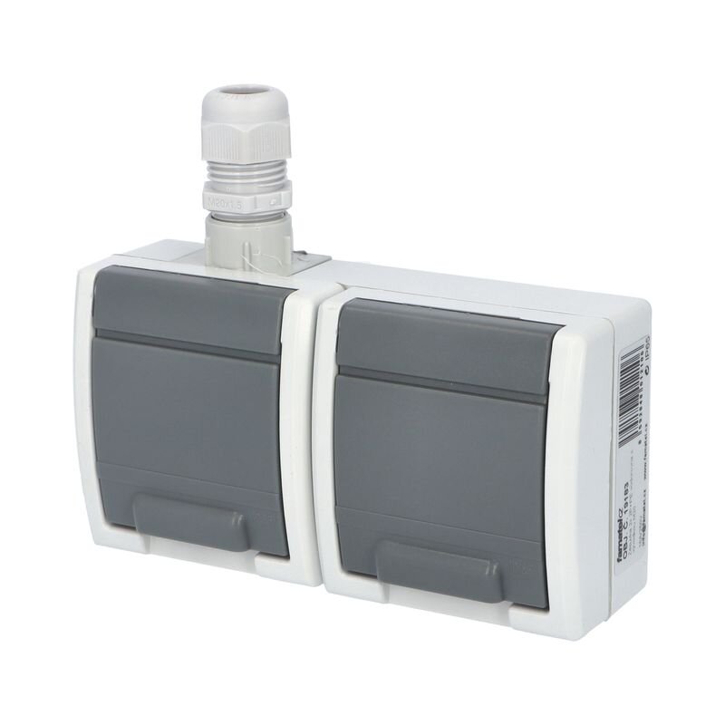 ATLAS 19183 IP65 Zásuvka 2x 2P+PE, 2-násobná vodorovná s vývodkou M20, na povrch, šedá.