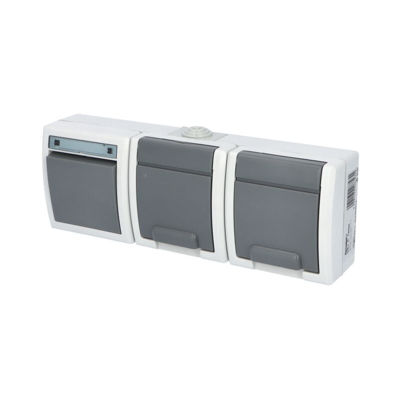 ATLAS 19094 IP55 Přepínač č.6 + zásuvka 2x 2P+PE, 2-násobná vodorovně s ochr. kolíkem, na povrch, šedý.