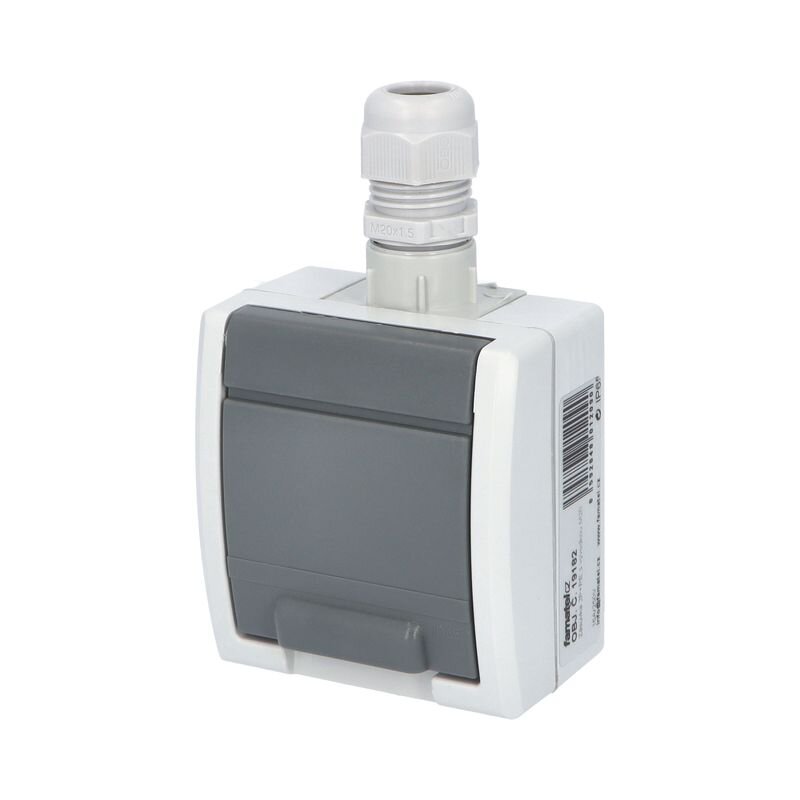 ATLAS 19182 IP65 Zásuvka 2P+PE s vývodkou M20, na povrch, šedá.