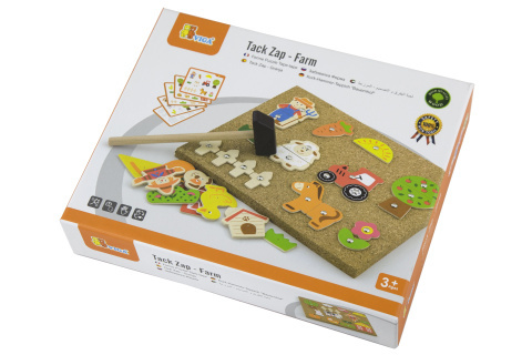 Tato sada obsahuje 24 různých dřevěných dílků, korkovou desku a praktické kladívko s přípínáčky. Díky nim mohou děti bezpečně a zábavně zatloukat jednotlivé dílky, rozvíjet svou přesnost a soustředění. Rozměry balení jsou přibližně 24,5 x 20 x 5 cm, takže hračka je snadno přenosná a vhodná do každého dětského koutku. Vhodné pro děti od 3 let.